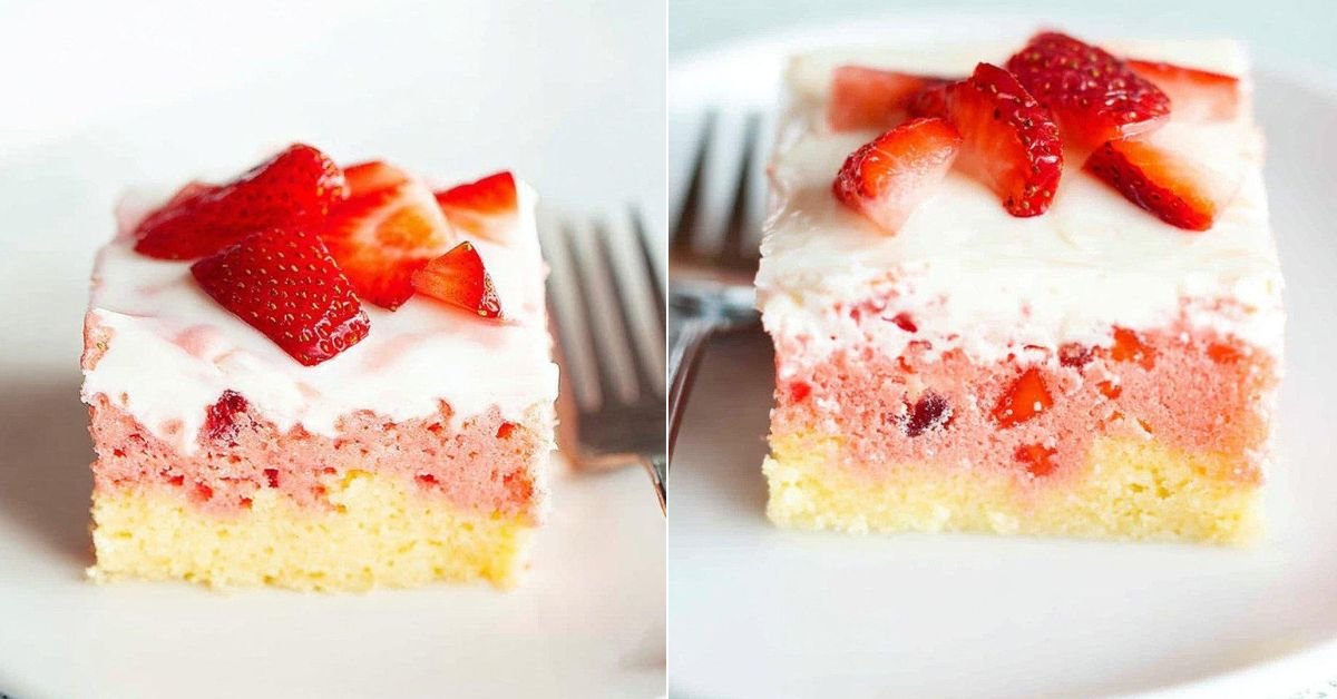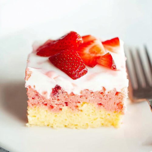 • This strawberry poke cake recipe is incredibly moist, creamy, and packed with fresh strawberry flavor.