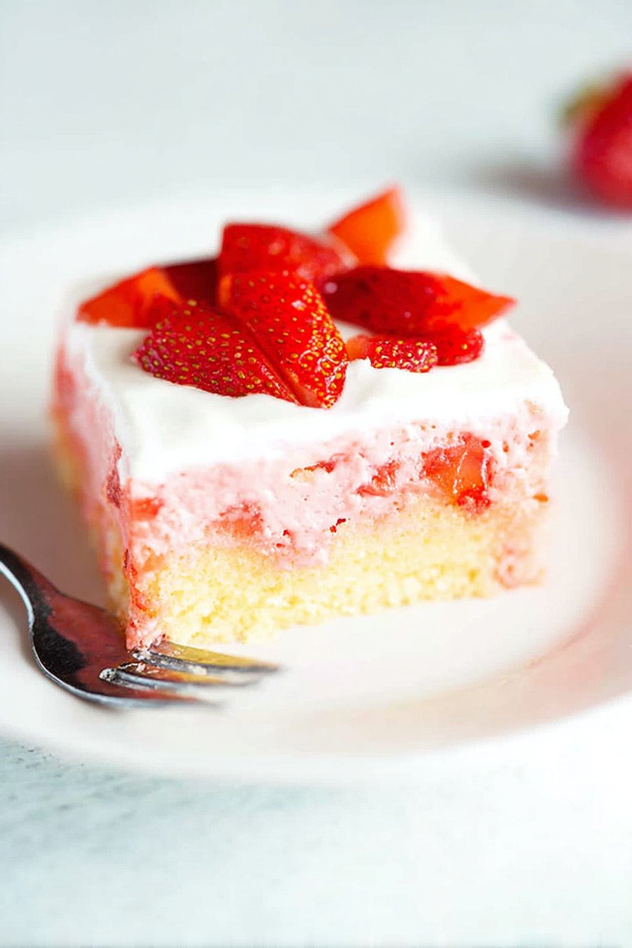 Store leftover strawberry cake recipe portions in an airtight container in the refrigerator. It will stay fresh for up to 3–4 days while maintaining its creamy texture.